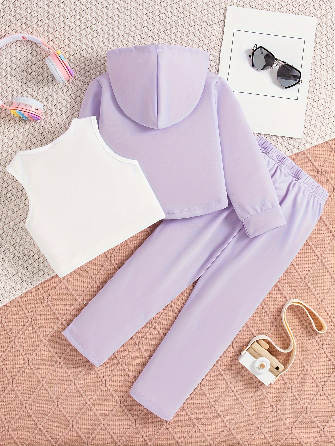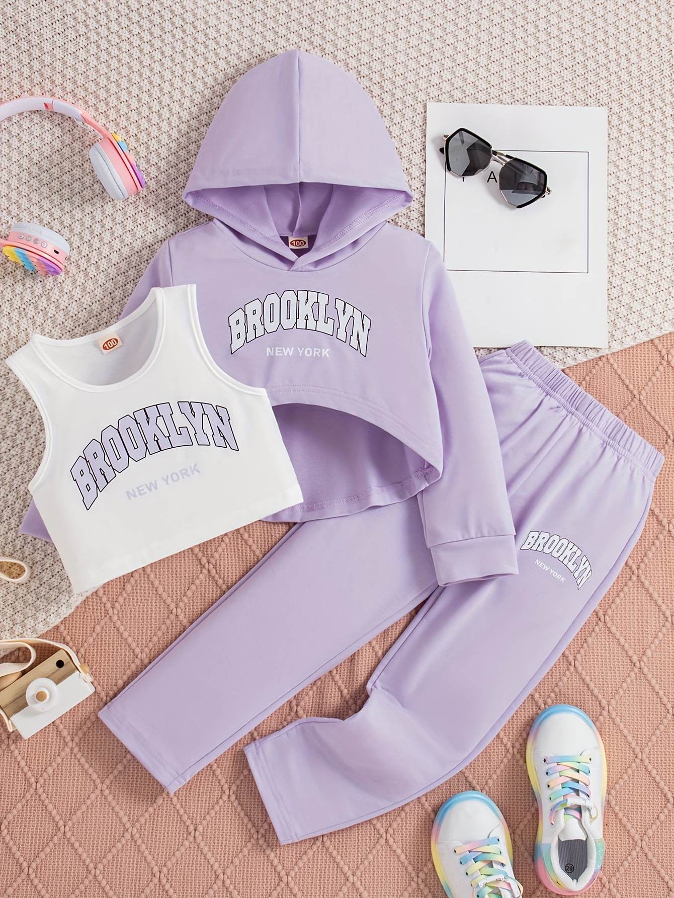 This 3-piece outfit set includes a hoodie, tank top, and jogger pants designed for girls, perfect for spring and fall activities. Featuring a stylish BROOKLYN print, the breathable fabrics ensure comfort during sport and play. The coordinated pieces offer versatile layering options for changing weather, providing practical wear that supports an active lifestyle with ease.